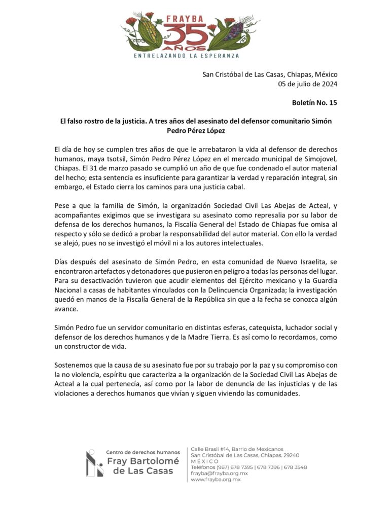 “la familia de Simón, la organización Sociedad Civil Las Abejas de Acteal, y acompañantes exigimos que se investigara su asesinato como represalia por su labor de defensa de los derechos humanos, la Fiscalía General del Estado de Chiapas fue omisa al respecto y sólo se dedicó a probar la responsabilidad del autor material. Con ello la verdad se alejó, pues no se investigó el móvil ni a los autores intelectuales”, mencionaron en el comunicado.