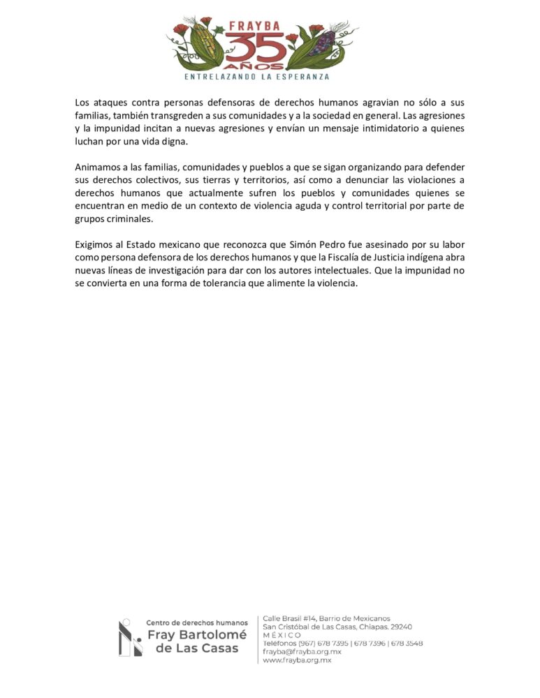 “Exigimos al Estado mexicano que reconozca que Simón Pedro fue asesinado por su labor como persona defensora de los derechos humanos y que la Fiscalía de Justicia indígena abra nuevas líneas de investigación para dar con los autores intelectuales. Que la impunidad no se convierta en una forma de tolerancia que alimente la violencia”, Frayba.