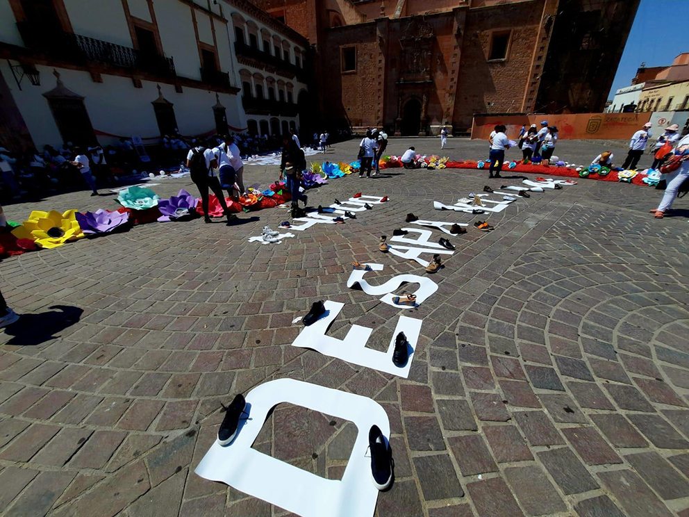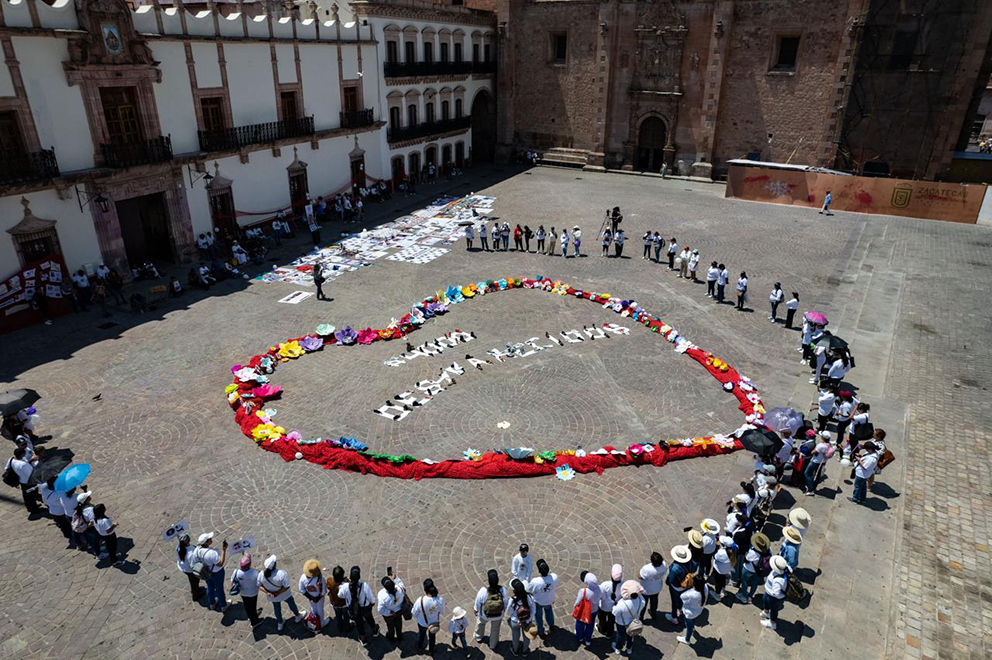 Al término de la protesta del 10 de mayo, las madres buscadoras crearon con decenas de metros de rafia tejida un enorme corazón rojo, que colocaron frente al Palacio de Gobierno. Al centro pusieron los zapatos de sus hijas e hijos desaparecidos, y flores adornadas con sus fotografías. Ese manto, que suma centímetros en cada nuevo acto de la unión de colectivos, es también el símbolo de una crisis que permanece sin respuesta.