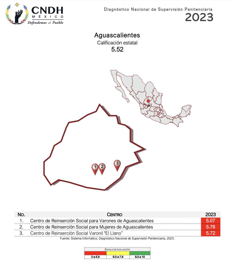 El Diagnóstico Nacional de Supervisión Penitenciaria 2023, elaborado por la Comisión Nacional de Derechos Humanos, dicta que los tres CERESOS en Aguascalientes están saturados, tienen deficiencias en sus instalaciones e incluso problemas serios en la prestación de servicios médicos. Los tres fueron reprobados en esta evaluación: ninguno alcanzó una calificación mínima de seis.