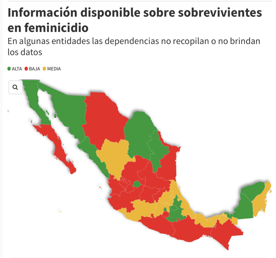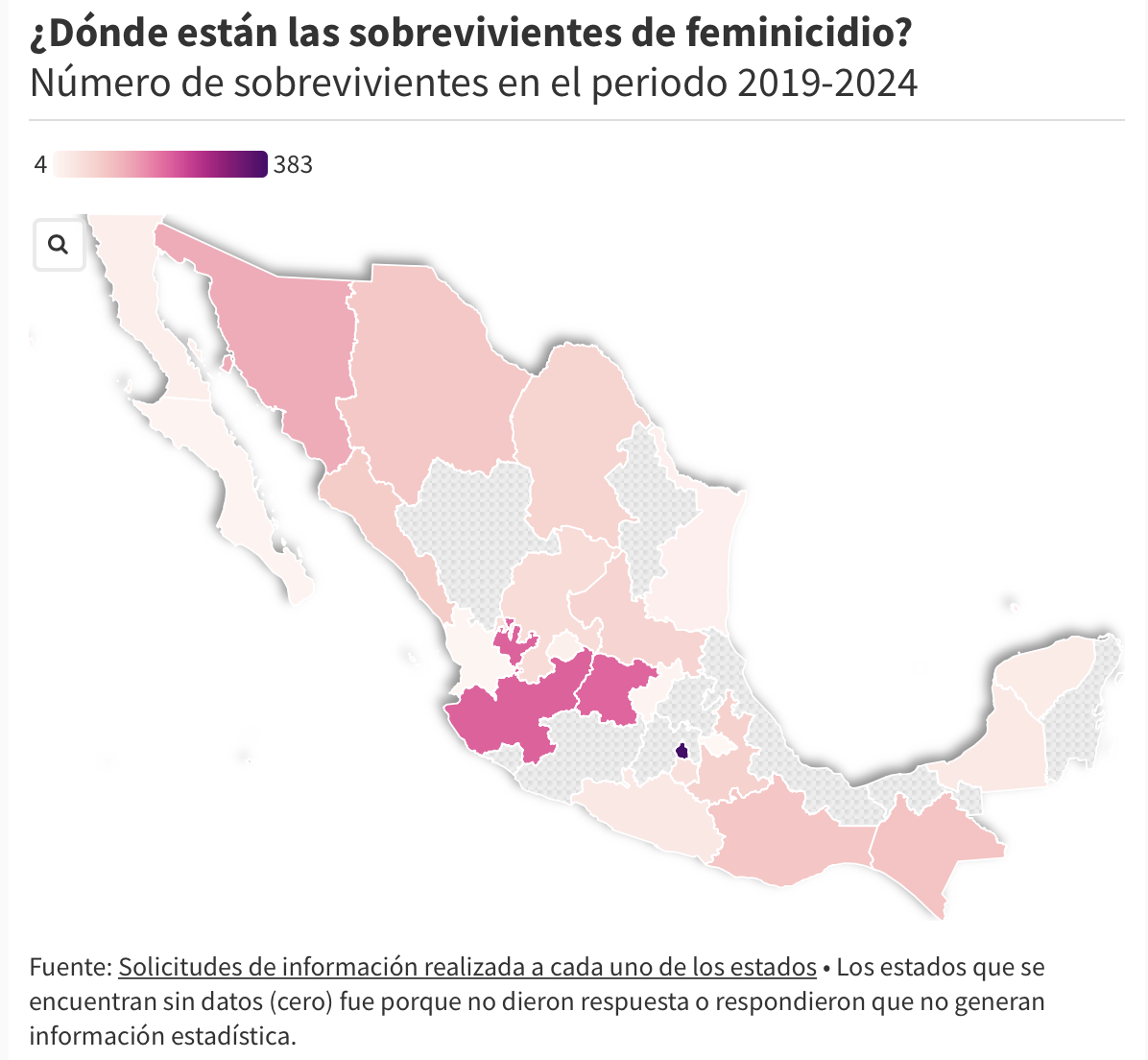 En el último sexenio (de 2019 a 2024) en México hay al menos mil 847 sobrevivientes del delito de feminicidio, según respuesta a solicitudes de información realizadas a las Fiscalías de todo el país. Sin embargo, la cifra es mayor, ya que algunos estados respondieron que no registran a las víctimas. Aunque el feminicidio es un delito, no consideran que tengan la obligación de resguardar las numeralias de cuántas víctimas resultaron del delito en grado de tentativa.