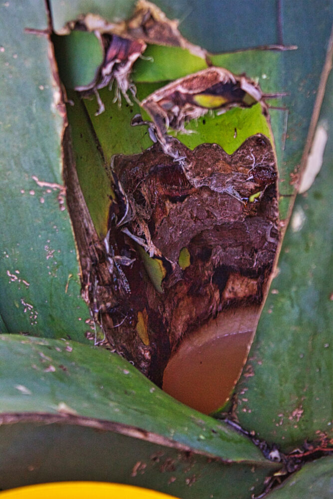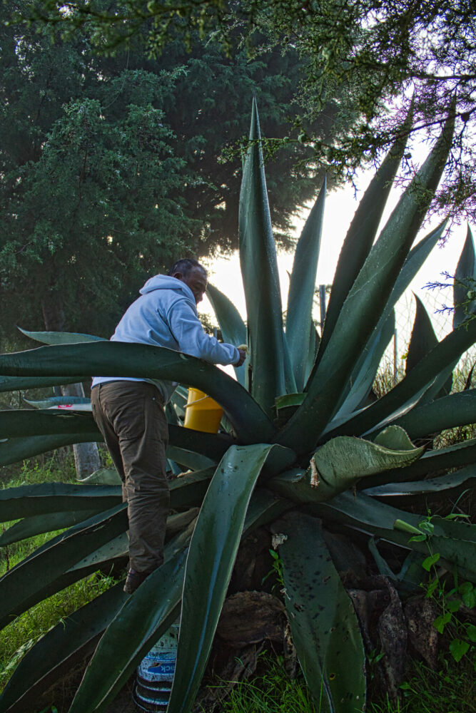 Una vez identificado el maguey, se corta una penca por el centro y se talla hacia la parte inferior hasta formar un hoyo por medio del cual se recogerá el aguamiel después de una semana.