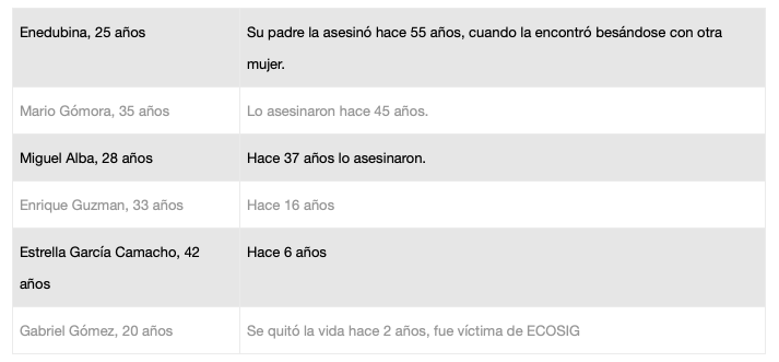 “Y empezamos a registrar la memoria histórica de los asesinatos de las personas LGBT aquí en Calimaya y nos dimos cuenta de que hace 60 años mataron a personas LGBT aquí en el municipio, pero por crímenes de odio y discriminación. Y son cinco crímenes de odio que se realizan aquí, el primero de estos casos es una que su propio padre la asesina atrás de la puerta de su casa porque la encontró besándose con otra mujer”, dijo.