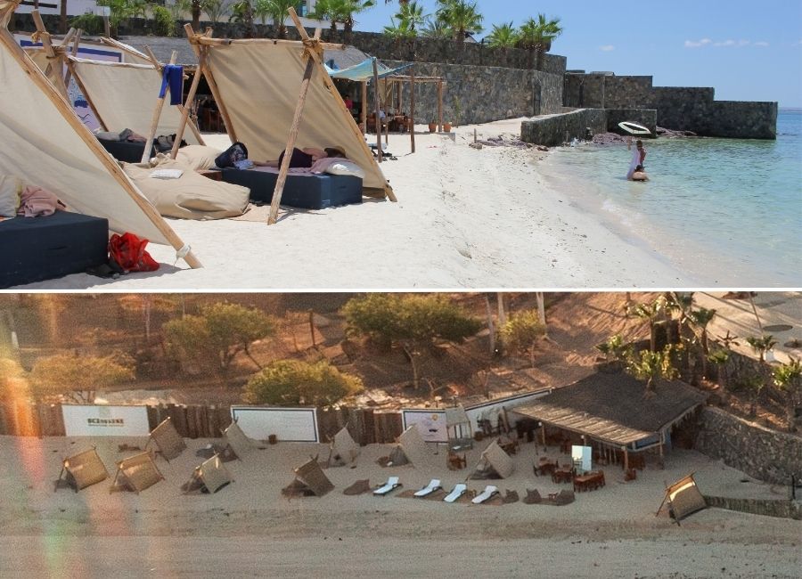 Instalaciones sobre Zofemat del club de playa. Fuente: Arriba, Daniela Reyes; Abajo redes sociales de El Caimancito