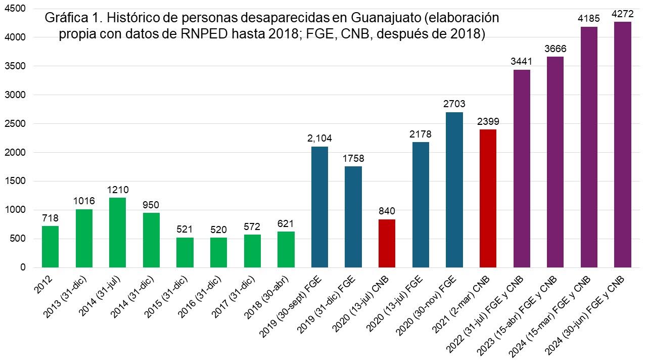 La cifra de personas desaparecidas se ha multiplicado casi siete veces, pasando de 621 personas en abril de 2018 a 4,272 en junio de 2024. Los municipios con más personas desaparecidas son Celaya (505 personas), Irapuato (472), León (459), Villagrán (265) y Pénjamo (222).
