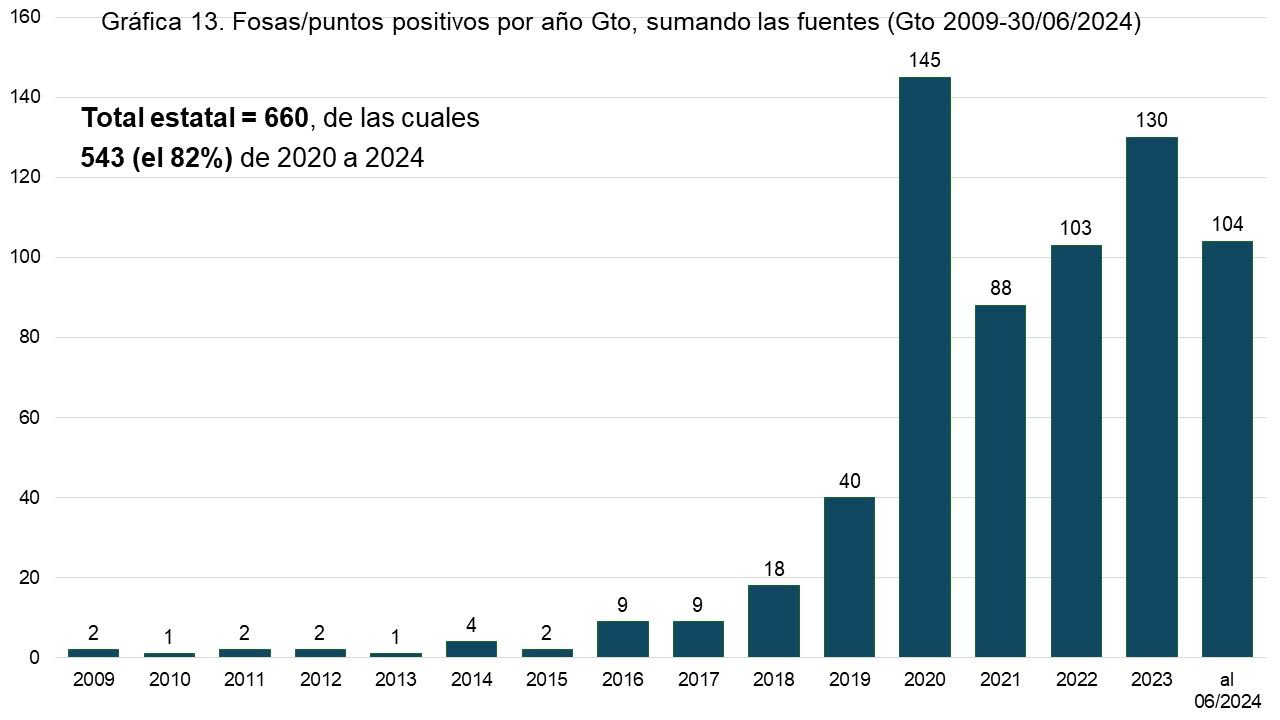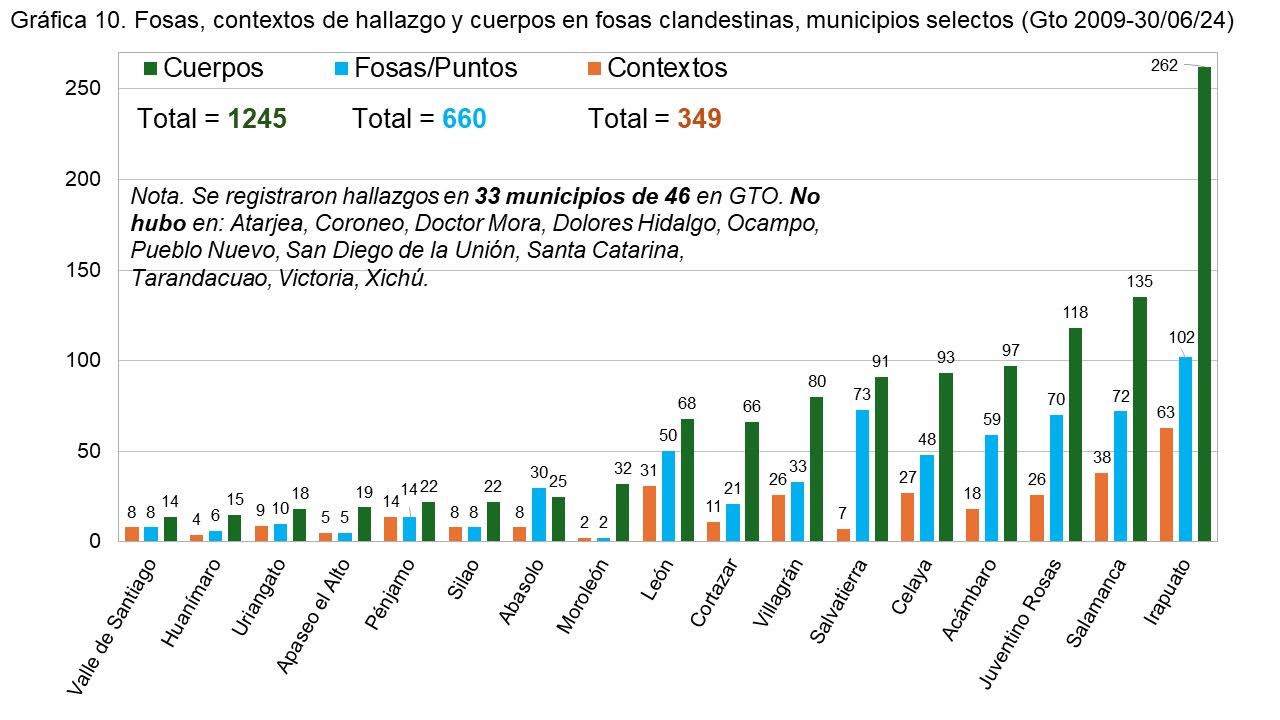 Entre enero de 2009-junio de 2024 se registraron en Guanajuato por lo menos 660 fosas clandestinas, en 349 distintos contextos de hallazgo de las cuales fueron exhumados 1,245 cuerpos en 33 de los 46 municipios.