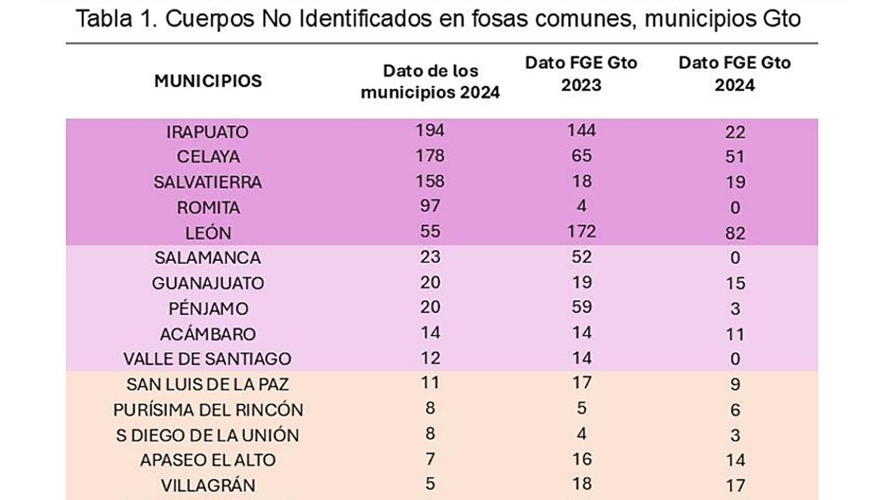 Los diez municipios con mayor número de cuerpos y fosas clandestinas son Irapuato, Salamanca, Juventino Rosas, Acámbaro, Celaya, Salvatierra, Villagrán, Cortazar, León y Moroleón. Un punto máximo en los hallazgos fue en 2020, con el registro de 309 cuerpos en 145 fosas. El segundo año con más registros fue el 2023, con 243 cuerpos en 130 fosas clandestinas.