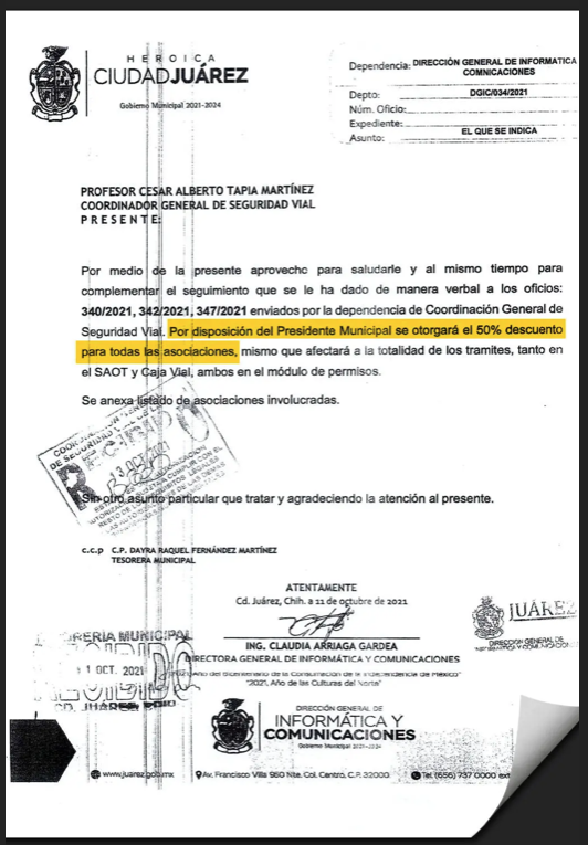 Antes de esa disposición, el Municipio de Juárez ya había firmado al menos tres autorizaciones (correspondientes a los oficios TM/CJT/3034/2021, TM/CJT/3037/2021 y TM/CJT/3136/2021), en las que se comprometía a otorgar descuentos de entre 30 a 40 por ciento a diferentes agrupaciones de loteros, con el argumento de que los vehículos importados pudieran circular debidamente identificados “al momento de su reparación o pruebas de manejo”.