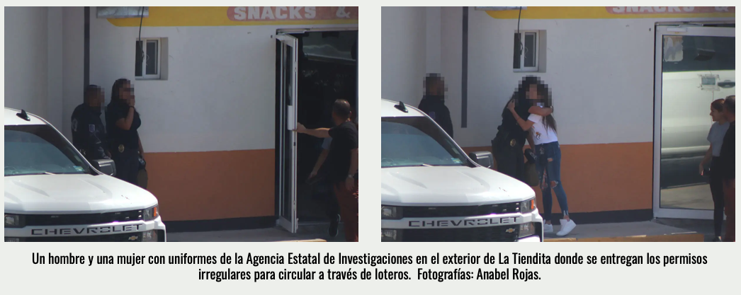 El pasado 31 de julio, por ejemplo, La Verdad Juárez fue testigo de cómo dos sujetos con armas y uniformes de la Agencia Estatal de Investigación llegaron al comercio en un vehículo oficial y saludaron a uno de los gestores encargados de entregar los permisos. Después de permanecer dos horas en el local, los policías se retiraron mientras seguía sin sobresaltos la operación de pago y entrega del documento oficial.