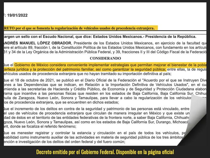 Según las autoridades federales, “el incremento de los delitos en contra de la seguridad y patrimonio de las personas está vinculado, entre otros factores, con el uso de vehículos de procedencia extranjera que circulan de manera irregular en México y que existe una considerable cantidad de éstos en el territorio de las entidades federativas de la frontera norte”, como se indica en el Decreto por el que se fomenta la regularización de vehículos usados de procedencia extranjera.