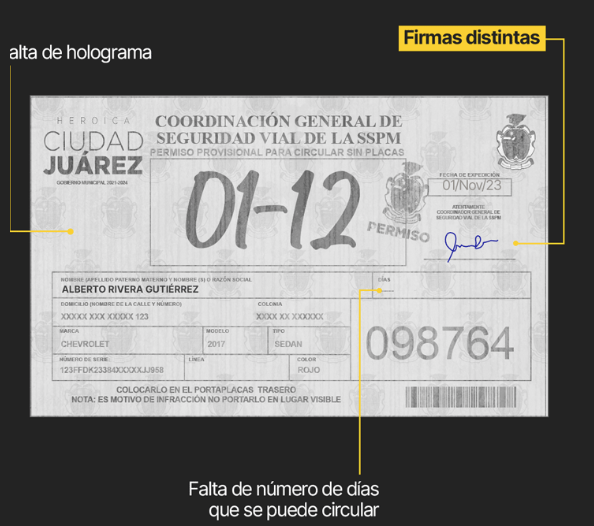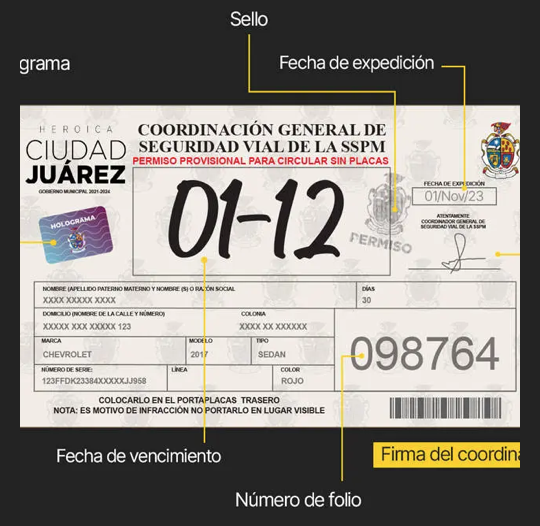 El permiso que actualmente expide la CGSV de Juárez está impreso a color y exhibe un holograma, el sello de la corporación, número de folio, fecha de expedición, número de días de vigencia del permiso, fecha de vencimiento, el escudo del Ayuntamiento de Juárez, la imagen institucional del Gobierno Municipal, y debe llevar la firma del coordinador general de la dependencia, César Alberto Tapia Martínez.