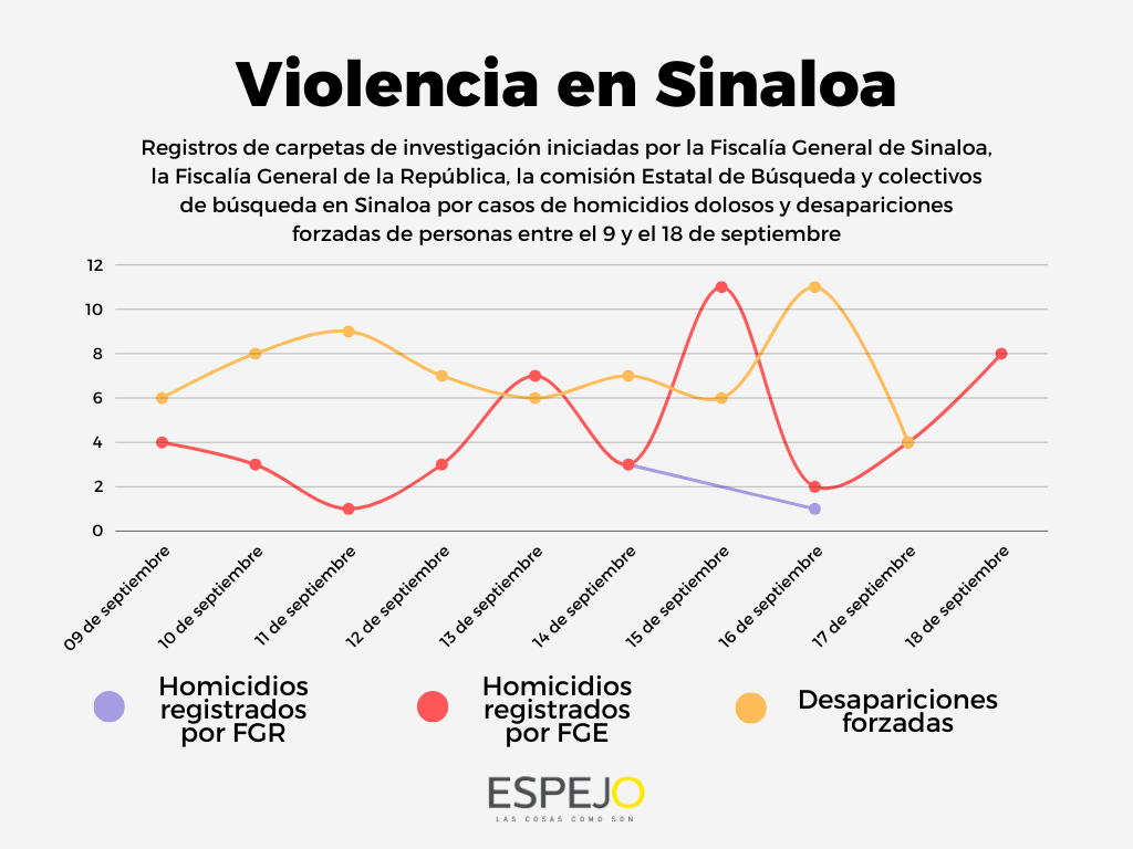 Hace 10 días comenzó un periodo de violencia en Sinaloa, una “guerra” que ha dejado 51 asesinatos, 64 personas desaparecidas de manera forzada, al menos 30 enfrentamientos y un pueblo entero (El Palmito, Concordia), desplazado. Son datos de la Fiscalía General del Estado, la Comisión Estatal de Búsqueda, colectivos de búsqueda y la Secretaría de Seguridad Pública.