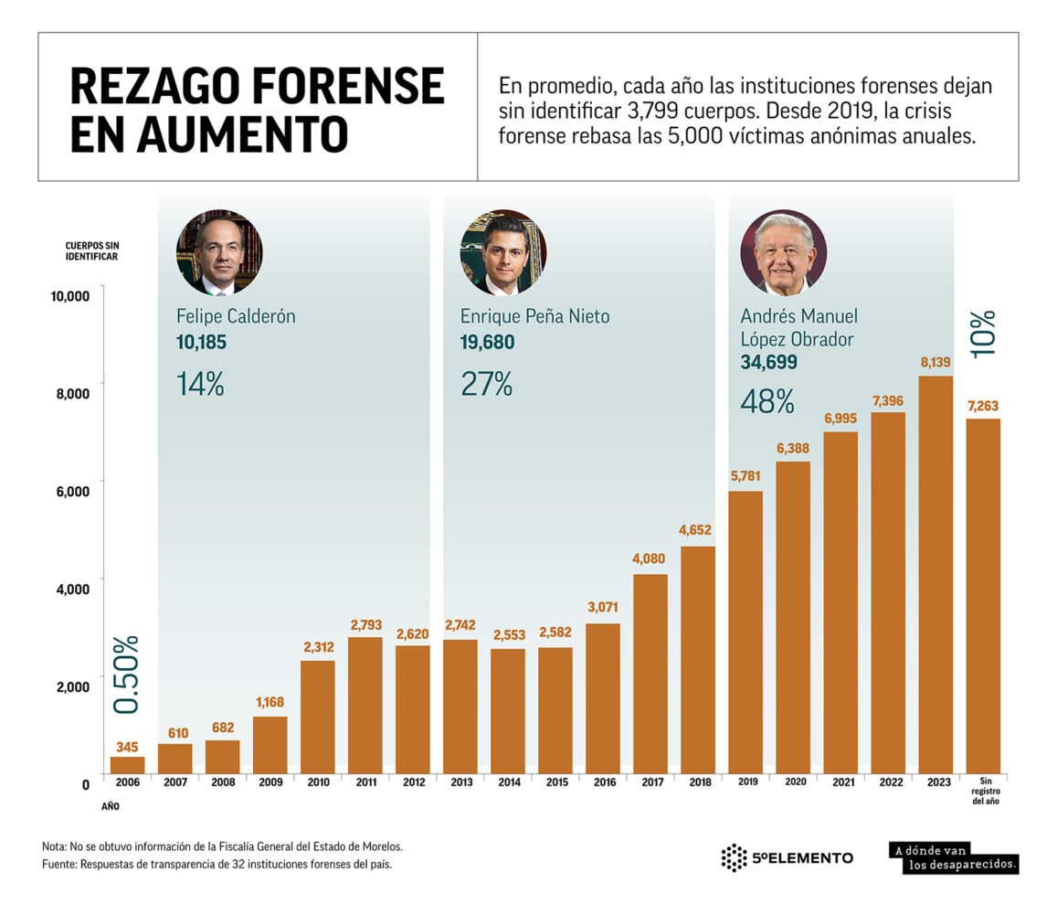 De 2019 a 2023, durante el gobierno de López Obrador, ingresaron a las morgues 34 mil 699 cuerpos que permanecen sin identidad. Aunque el presidente prometió atender de manera prioritaria la crisis forense y las desapariciones de personas —que en este sexenio suman 51 mil 791 víctimas—, las iniciativas para enfrentarlas: el Mecanismo Extraordinario de Identificación Forense, el Centro Nacional de Identificación Humana y el Banco Nacional de Datos Forenses, fueron desmanteladas o no se concretaron