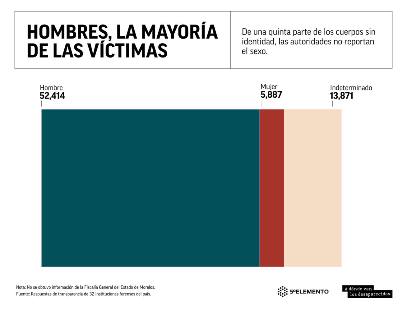 De las 72 mil 172 víctimas sin identificar registradas hasta 2023, el 73 por ciento (52 mil 414) son hombres, y el 8 por ciento (5 mil 887) son mujeres. Del 19 por ciento (13 mil 871) restante no se reporta el sexo.