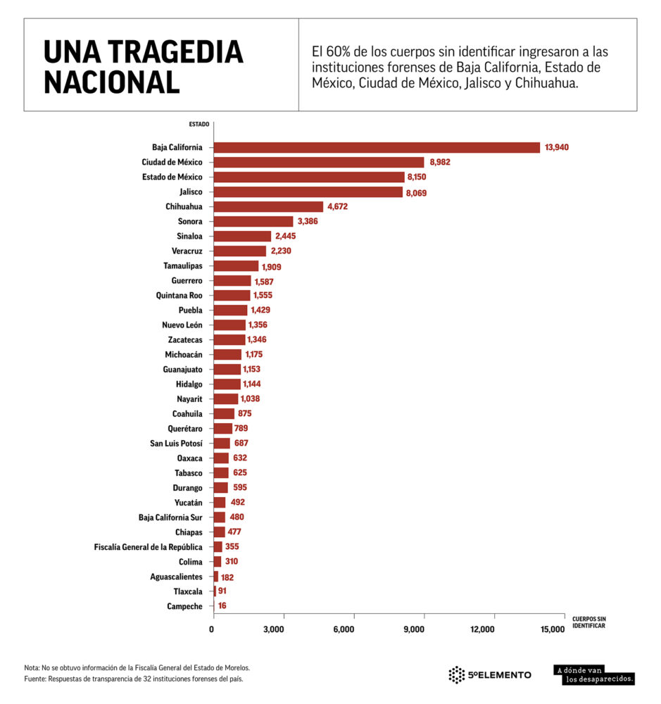 La mayoría de los cadáveres se concentran en cinco entidades: Baja California, Estado de México, Ciudad de México, Jalisco y Chihuahua, de donde provienen 6 de cada 10 cuerpos, 43 mil 813 en total. Baja California ocupa el primer lugar; hasta diciembre de 2023 había 13 mil 940 personas fallecidas en espera de ser sacadas del anonimato por peritos forenses.