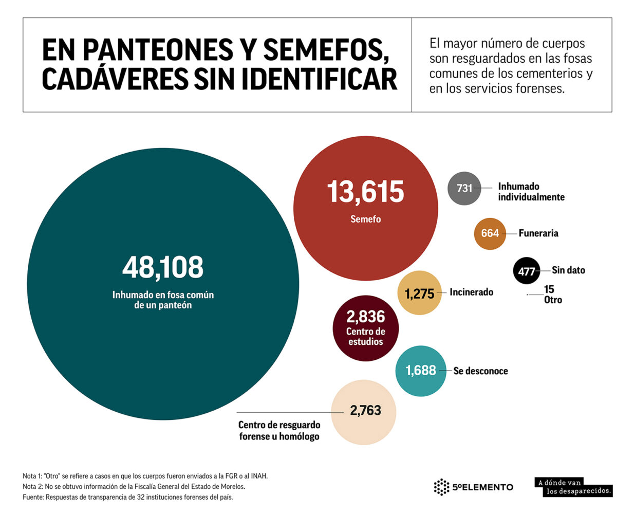 Estas inéditas cifras de cadáveres que permanecen sin identificar, obtenidas por Quinto Elemento Lab y A dónde van los desaparecidos mediante solicitudes de transparencia enviadas a las 32 instituciones forenses del país —solo la Fiscalía General del Estado de Morelos se negó a responder— y a la Fiscalía General de la República (FGR), abarcan los sexenios de Calderón, Peña Nieto y López Obrador.