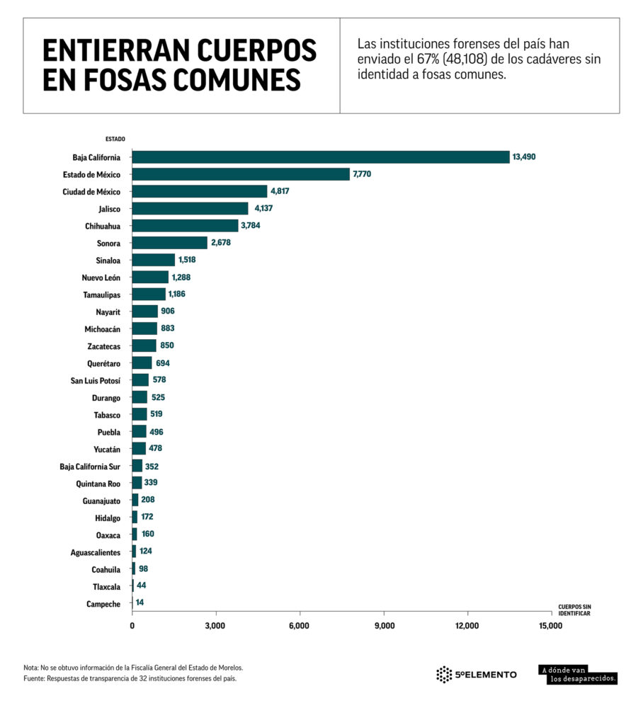 Los estados con mayor número de cuerpos NN en fosas comunes son Baja California con 13 mil 490; el Estado de México con 8 mil 836, y la Ciudad de México con 4 mil 817 —en el Panteón Civil de Dolores—; junto con Jalisco y Chihuahua, estas cinco entidades concentran el 47 por ciento del total. Son también los estados que acumulan más cuerpos sin identificar.