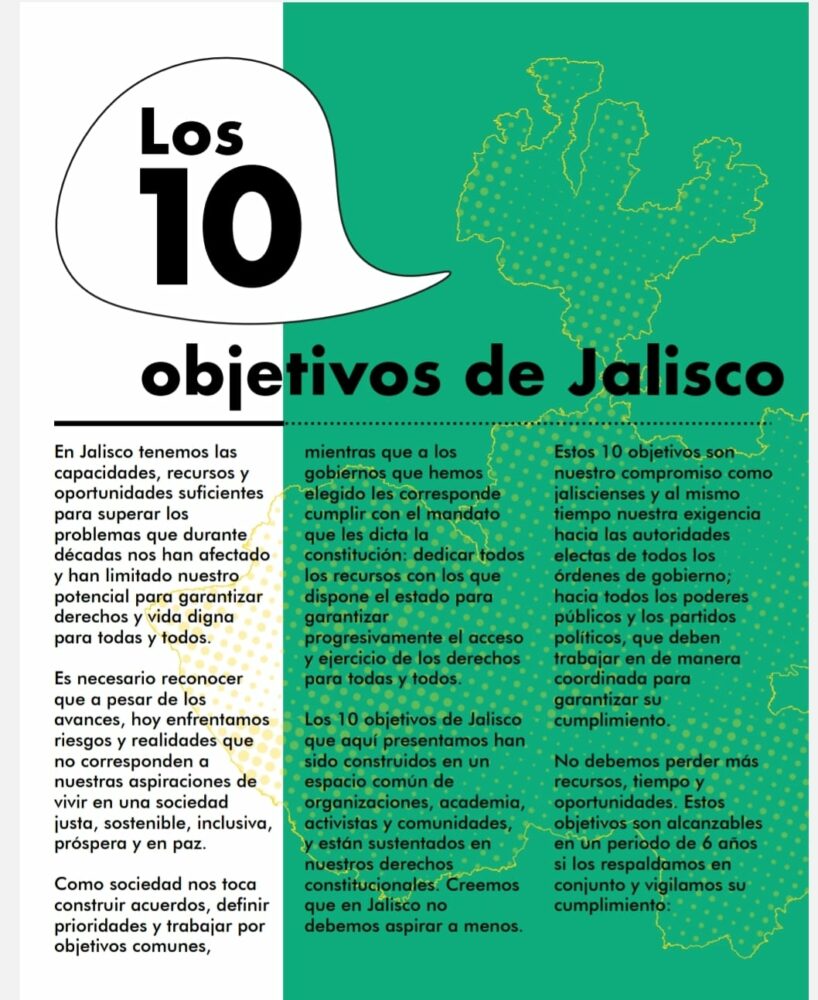 En una conferencia de prensa en Guadalajara, organizaciones de la sociedad civil presentaron los “10 Objetivos de Jalisco”, un conjunto de propuestas que exigen a los próximos gobiernos locales, municipales y estatal priorizar temas clave para el bienestar de la población. Las demandas incluyen la protección de los derechos humanos, la erradicación de la violencia y la preservación del medio ambiente.
