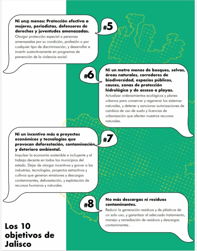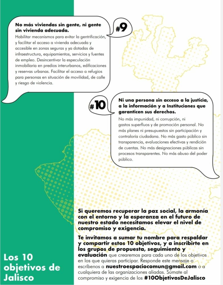 Colectivos y organizaciones civiles presentaron un decálogo dirigido a los futuros gobiernos estatales y municipales de Jalisco, en éste les exigen medidas urgentes en temas como: desapariciones, protección de mujeres, periodistas y defensores, así como la preservación de áreas naturales, todos estos temas señalaron deberán ser prioritarios para sus gobiernos.