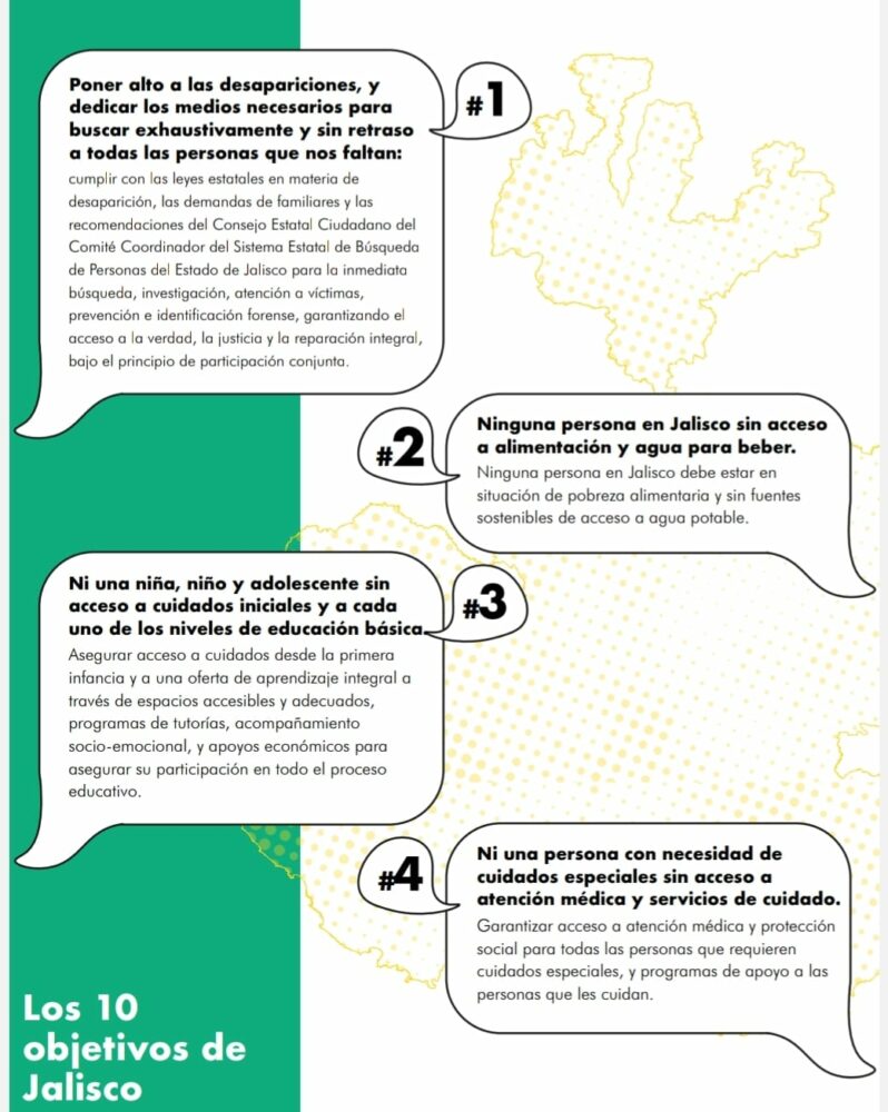 El primer objetivo presentado es detener las desapariciones forzadas, una de las crisis humanitarias más graves en Jalisco, que ocupa el primer lugar a nivel nacional en número de personas desaparecidas.