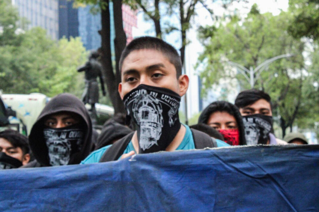 Los normalistas llegaron en 26 autobuses procedentes de la Escuela Normal Rural Raúl Isidro Burgos de Ayotzinapa, para reclamar la aparición con vida de sus compañeros desaparecidos por el Estado mexicano en Iguala, Guerrero; en la caravana venían normalistas de las 17 normales del país.