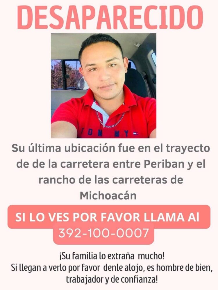 Por seguridad, el señor Sergio le pidió a su hijo que reportara cada hora. Así fue hasta después de las 8:00 de la noche cuando perdieron el contacto con él. En ese momento Sergio se encontraba cerca del poblado de Tarecuato, Michoacán.