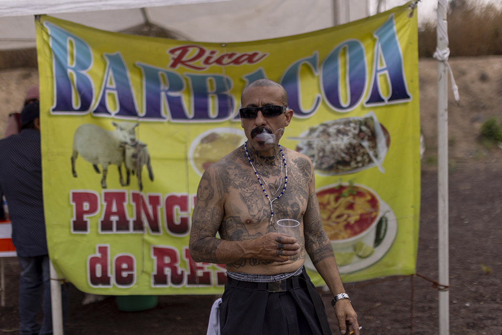 Concheros bailan vestidos con plumas, enmascarados y pintados con el acompañamiento de tambores en la pequeña multitud dedicado a la cultura chola– rapados, tatuados, con gafas negras de brazo ancho, vestidos con pantalones Dickies, camisas con el botón más alto cerrado y zapatos Nike Cortés.
