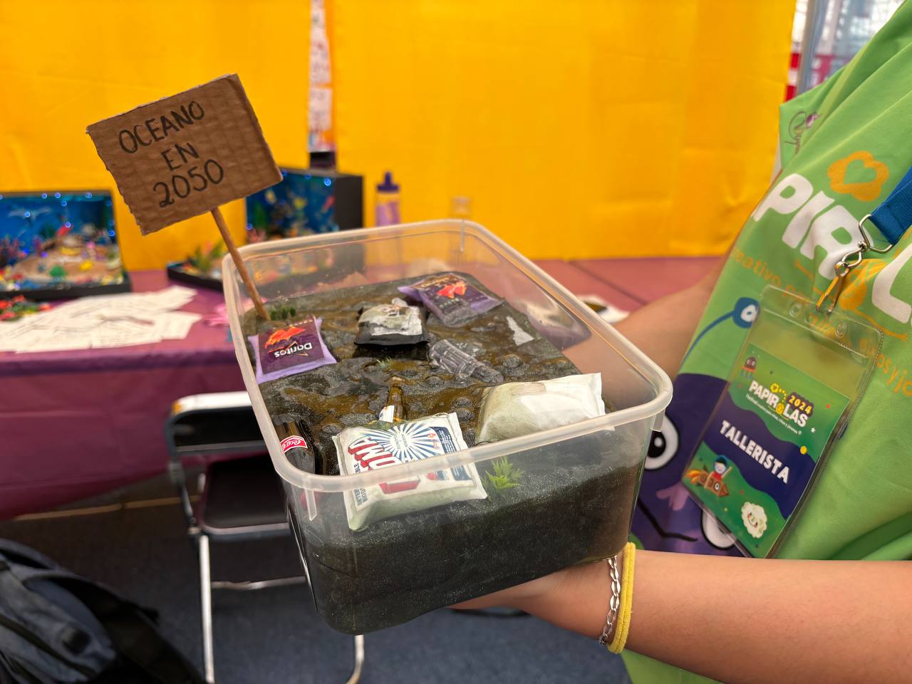 Para lograr esto, la primera actividad se realizó una maqueta de slime que simuló ser un océano contaminado donde los niños tenían que extraer toda la basura que ahí se encuentra: “con esto se quiere concientizar sobre los problemas que hay en el mar y cómo afecta la basura a los animales”, expresó Dafne Alcocer, bióloga marina y tallerista.