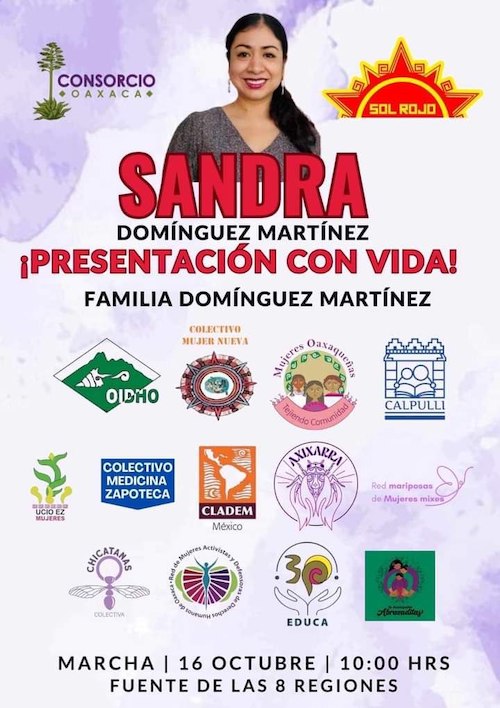 En tanto, colectivas feministas y de defensa de derechos humanos, así como familiares de Sandra Domínguez, convocaron a participar en una marcha para exigir la aparición con vida de la activista Ayuuk, para este miércoles 16 de octubre a las 10:00 horas.
