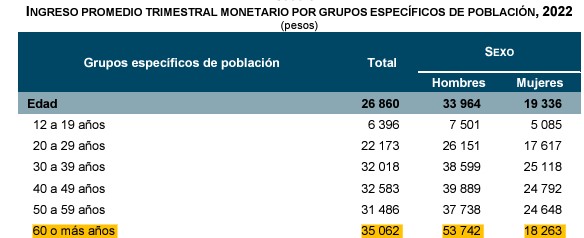 A la edad de +60 años, las mujeres perciben un salario de 6 mil pesos 445 y si se añade la interseccionalidad de ser hablante indígena, el salario de mujeres se reduce a la mitad, según refiere la Encuesta Nacional de Ingresos y Gastos de los Hogares Estacional (ENIGH E, 2022).