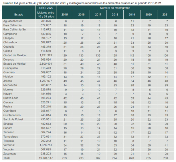 Prueba de ello es que en el 2022 solo había en el sector público 803 mastógrafos para la detección del Cáncer de Mama (CaMa) a nivel nacional para atender más de 66 millones de mujeres, tal como lo documenta una investigación de la revista Salud Pública de México.