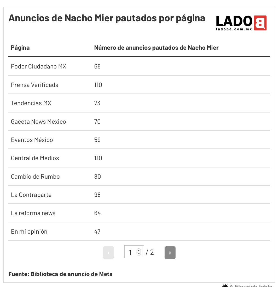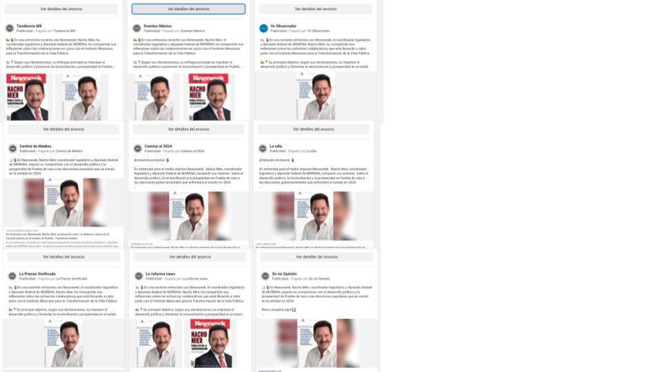 No todas las páginas que difundieron la imagen y las actividades públicas de Mier Velazco están asociadas a un dominio en internet, algunas sólo están en Facebook, pero todas pagan anuncios a Meta. Las que se hacen pasar por medios de comunicación son: