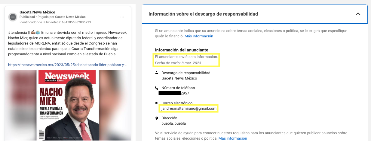 Esta página, si bien no pautó para Mier Velazco sino para otros personajes como el panista Eduardo Rivera, sí mantiene vinculación con la red porque tiene el mismo correo reportado en el descargo de responsabilidad de otras páginas, al menos hasta el 9 de marzo de 2023: jandresmaltamirano@gmail.com.