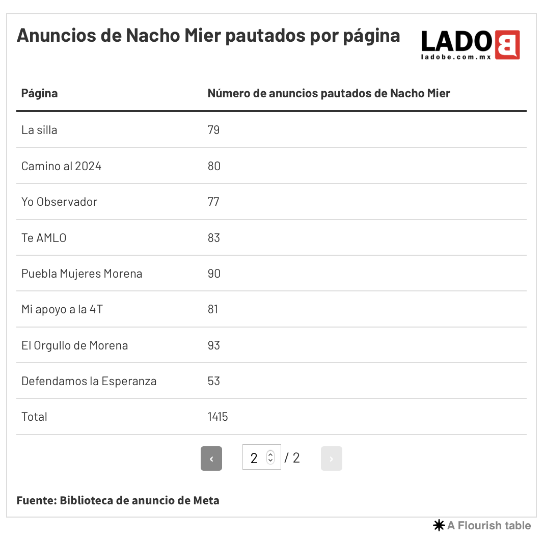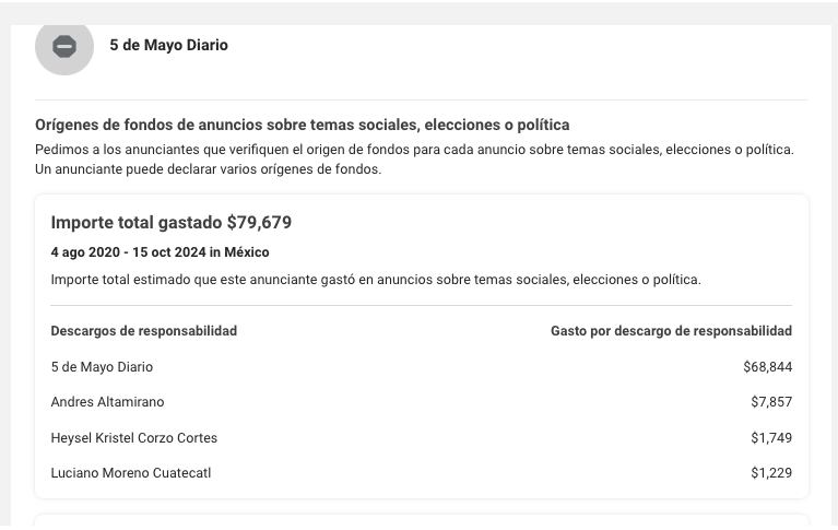 Y fue uno de sus principales beneficiados, pues sus actividades fueron promocionadas en 18 de las 28 páginas detectadas, con 1, 415 anuncios pautados en Facebook, lo que representa el 36% de los 3, 930 anuncios que esa red pago a Meta de acuerdo con la información que se puede consultar en la biblioteca de anuncios.