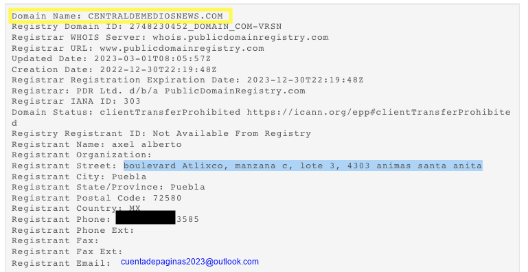 De acuerdo con una verificación de los datos del dominio, centraldemediosnews.com fue registrado el 12 de diciembre del 2022, y la dirección que se registró fue: Bulevard Atlixco, Manzana C. Lote 3, número 4303, colonia Animas Santa Anita en la ciudad de Puebla, la misma ubicación de las oficinas de Paralelo 19.