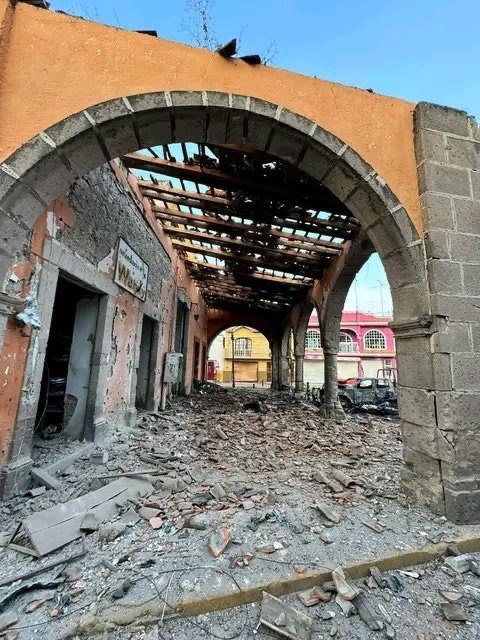 En Jerécuaro, las imágenes muestran la destrucción de los arcos en el centro de la ciudad, espacio donde se concentran comercios que quedaron afectados.