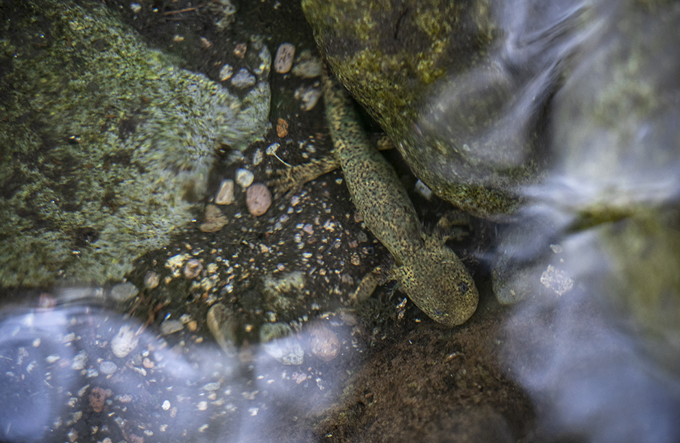 Ángela Camacho señala hacia el fondo del agua de un remanso del arroyo cercano a la cascada. Entre las piedras se esconden tres pequeños ajolotes de unos 15 centímetros.