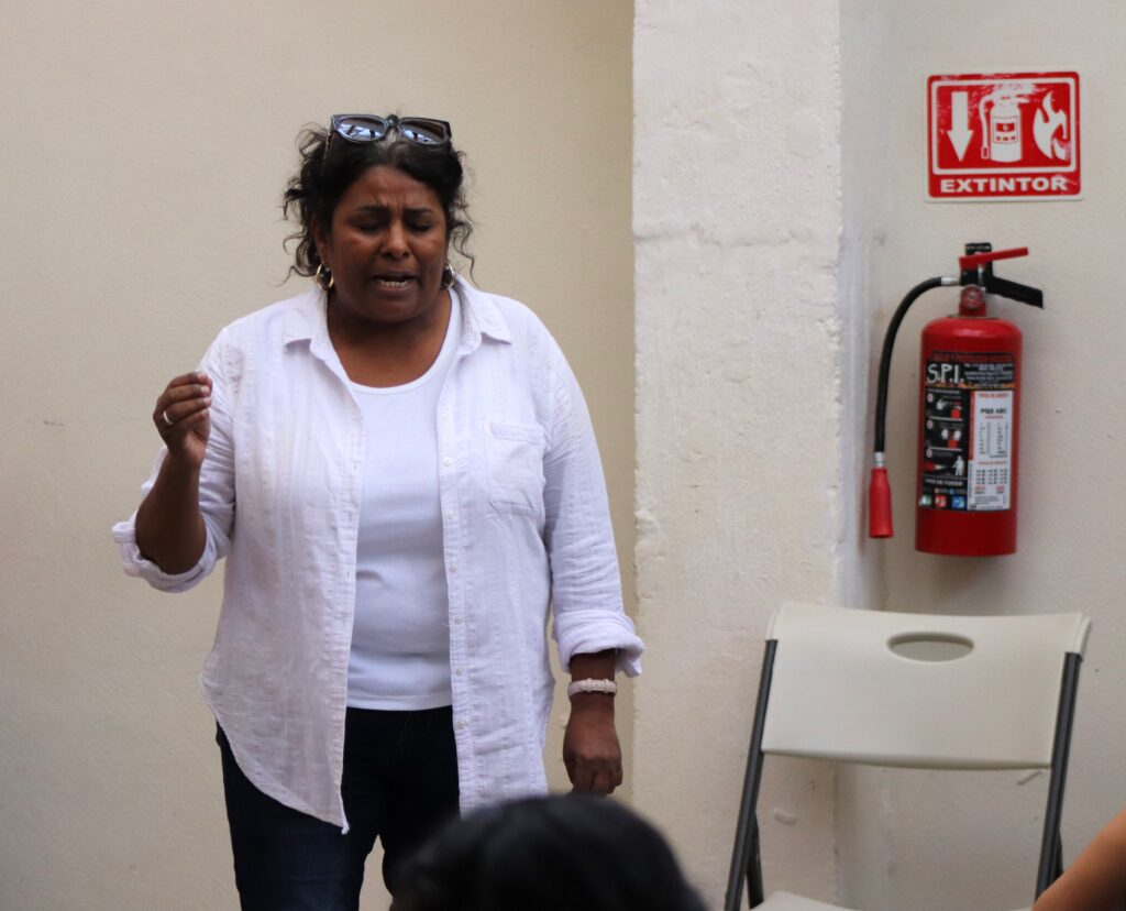 Rosa Mani, las guía, luego las observa. Dice que tiene cuatro años dando estos talleres, primero lo hizo en en albergues para migrantes, en ese momento había una concentración masiva de personas en movimiento en la ciudad. Luego en flujo migratorio bajo y volteo a otros lugares donde compartir con mujeres.