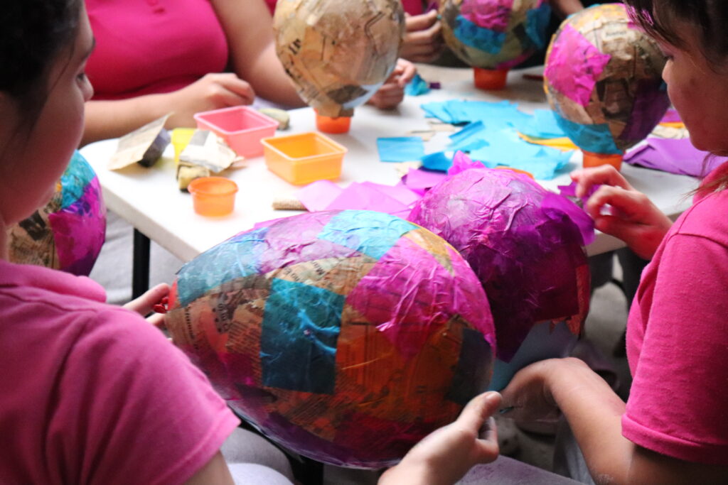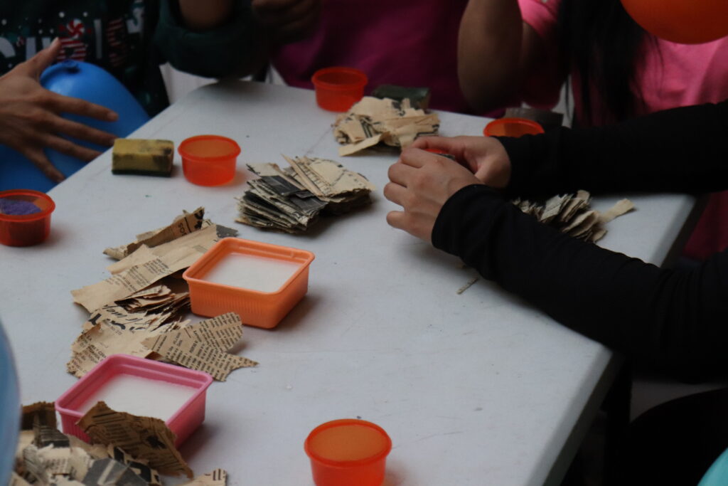 Conversan, inflan globos, cortan trozos de papel periódico, también de papel de china de distintos colores, se aconsejan sobre cómo avanzar más rápido.