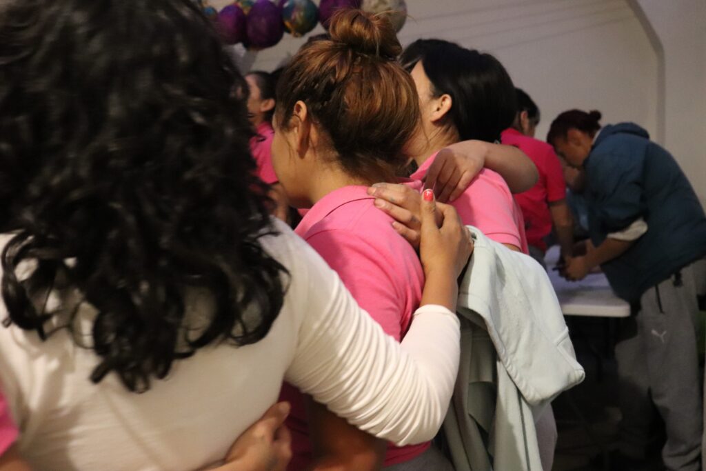 Esta tarde de octubre. Rosa Mani comparte con mujeres de Dame la Mano, un centro de rehabilitación en la ciudad. Ahí en el patio del lugar se reúnen más de 40 internas, todas visten de rosa.