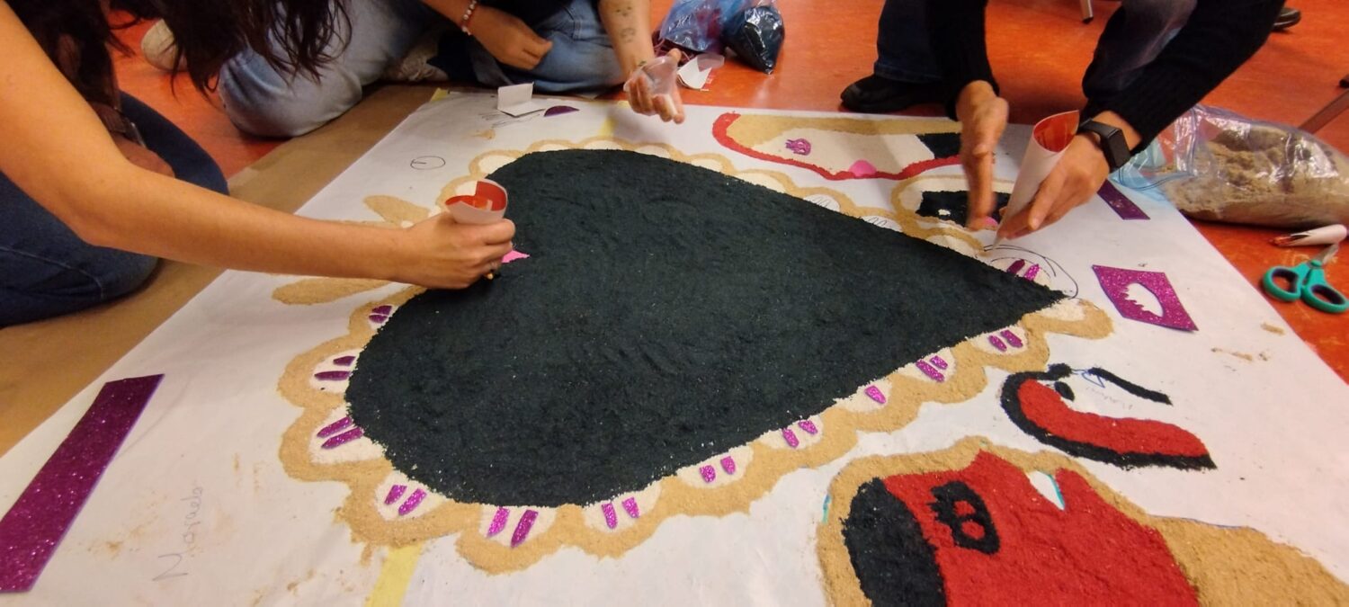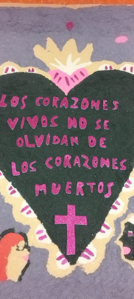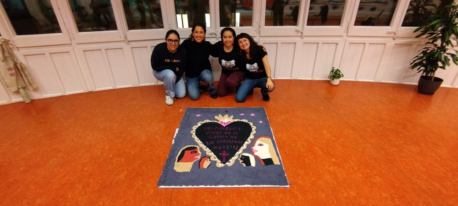 Furia mexicana, en colaboración con la psicóloga arte terapeuta Claudia Joss Daza, crearon un tapete inspirado en la tradición del Día de Muertos. Este acto performativo invitó a las personas del lugar a participar colocando un poco de aserrín pintado para completar el diseño con la frase: “los corazones vivos no se olvidan de los corazones muertos”.
