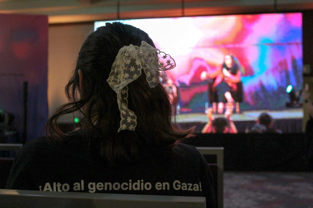 Su conferencia se dio en el marco de la Feria Internacional del Libro de Guadalajara, espacio en el que el Comité en Solidaridad con Palestina realizó una protesta en la que se recordó a las y los periodistas que han muerto durante la cobertura del genocidio que comete el Estado de Israel.
