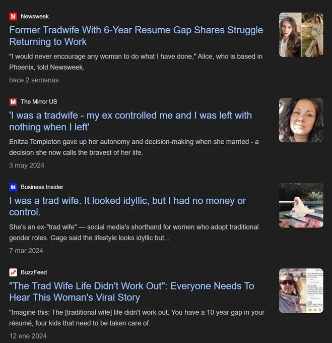 Resultados de búsqueda en Google sobre tradwives en Estados Unidos. La cobertura alrededor del tema ha cambiado drásticamente en los últimos dos años: de un contenido inocente a testimonios de mujeres que salieron de ese estilo de vida por la violencia de género.