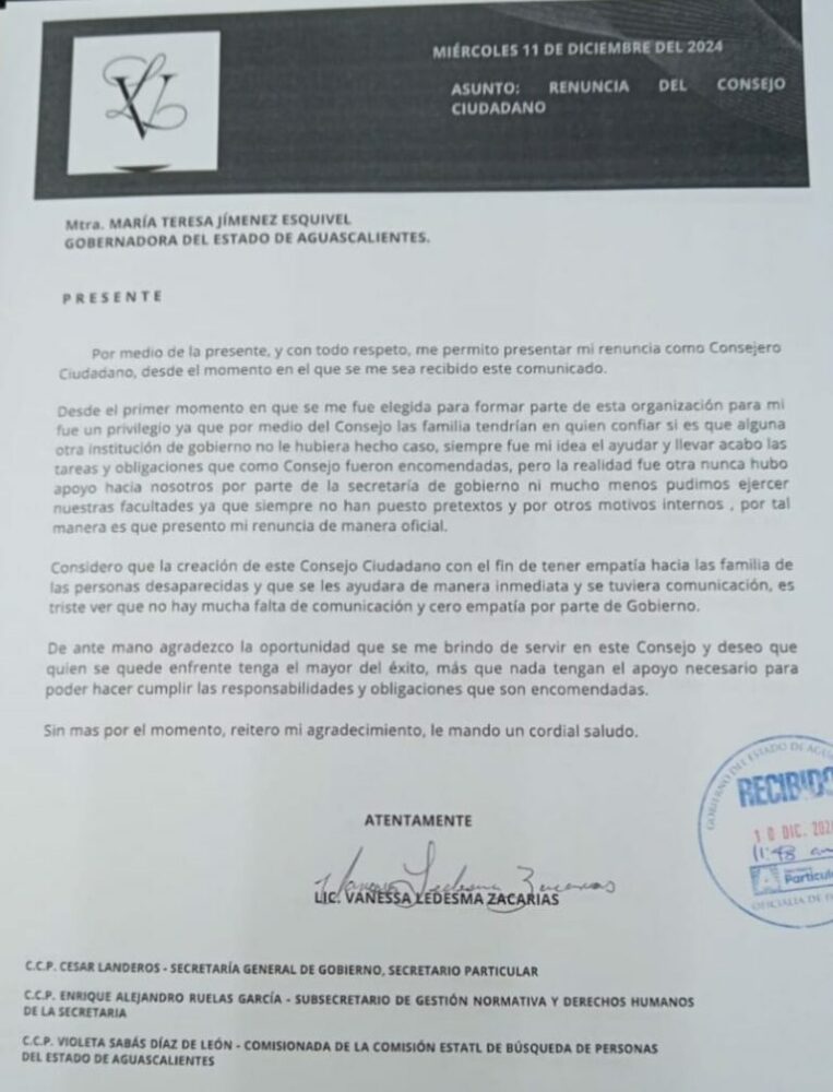 “(…) siempre fue mi idea el ayudar y llevar a cabo las tareas y obligaciones que como Consejo me fueron encomendadas, pero la realidad fue otra, nunca hubo apoyo hacia nosotros por parte de la Secretaría de Gobierno, ni mucho menos pudimos ejercer nuestras facultades, (…) es triste ver que no hay mucha falta de comunicación y cero empatía por parte del Gobierno”, dice su carta de renuncia.