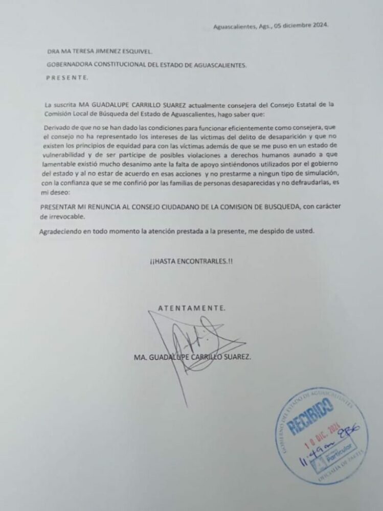 “Derivado de que no se han dado las condiciones para funcionar eficientemente como consejera, que el Consejo no ha representado los intereses de las víctimas del delito de desaparición y que no existen los principios de equidad para las víctimas, además de que se me puso en un estado de vulnerabilidad y de ser partícipe de posibles violaciones a derechos humanos aunado que lamentablemente existió mucho desánimo ante la falta de apoyo, sintiéndonos utilizados por el gobierno del estado y al no estar de acuerdo con esas acciones y no prestarme a ningún tipo de simulación, con la confianza que se me confirió por las familias de personas desaparecidas y no defraudarles, es mi deseo presentar mi renuncia”, dice la carta firmada por Guadalupe Carrillo Suárez, que desde 2007 busca a su esposo Carlos Hermosillo Gutiérrez, privado de la libertad por un comando armado junto con otras siete personas cuando laboraba como gerente del antro Maverick, el caso de desaparición múltiple más sentido en el estado.