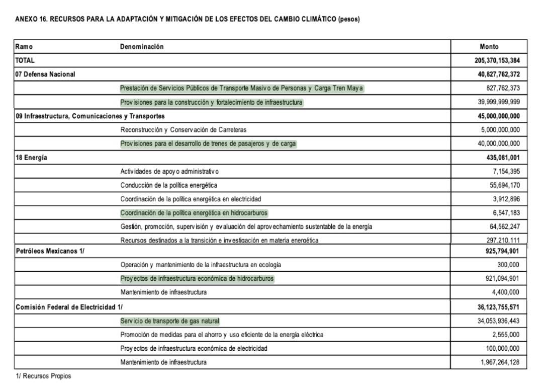 Asimismo, hay otras asignaciones que no están directamente relacionadas con el combate al cambio climático como los más de 40 mil millones para provisiones para el desarrollo de trenes de pasajeros y de carga, que utilizará la Secretaría de Infraestructura, Comunicaciones y Transportes; 39 mil 999 millones para construcción e infraestructura a cargo de la Sedena; 921 millones de pesos a proyectos de infraestructura económica de hidrocarburos para Petróleos Mexicanos (Pemex); y más de 6 millones en la política energética en hidrocarburos de la Secretaría de Energía.