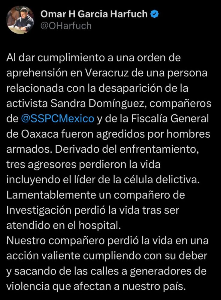 “Al dar cumplimiento a una orden de aprehensión en Veracruz de una persona relacionada con la desaparición de la activista Sandra Domínguez, compañeros de @SSPCMexico y de la Fiscalía General de Oaxaca fueron agredidos por hombres armados”, dijo el funcionario nacional.