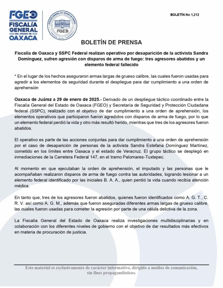 La Fiscalía de Oaxaca por su parte informó que el enfrentamiento ocurrió al amomento en que ejecutaban la orden de aprehensión, el imputado y las personas que le acompañaban realizaron disparos de arma de fuego contra las autoridades, logrando lesionar a un elemento federal identificado por las iniciales B. A. A., quien perdió la vida cuando recibía atención médica.