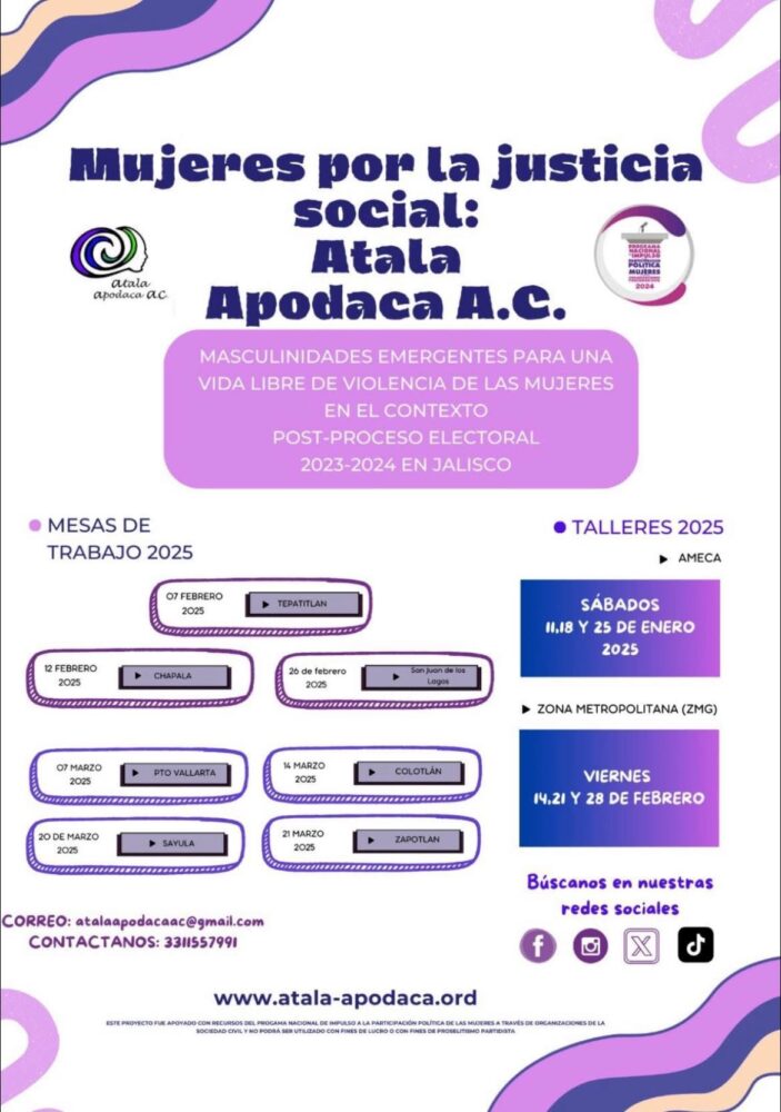 Finalmente, invitaron tanto a la ciudadanía como a los funcionarios públicos a participar en los talleres que impartirán el 14, 21 y 28 de febrero en el Museo Regional de Guadalajara a partir de las 9:30 am, donde estarán trabajando en la construcción de masculinidades emergentes y una vida política libre de violencia. Para más información consulta el Facebook de Mujeres por la Justicia Social Atala Apodaca