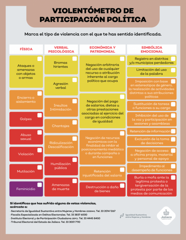 Ante esta situación, el Programa Nacional de Impulso para la Participación Ciudadana de las mujeres publicó un violentómetro político, en el cual las mujeres pueden identificar las conductas de riesgo, ya que algunas pueden llegar a parecer “imperceptibles” debido a lo normalizadas que están.